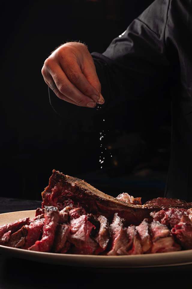 - Lomo de kobe ushido a la brasa sobre camita de setas shiitake salteadas, ajo, guindilla roja frita fresca, salsa omakase, escamas de sal maldón y pimienta de sichuan