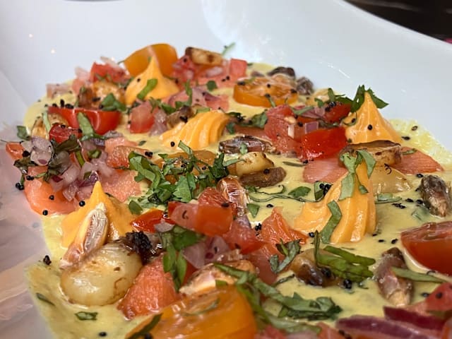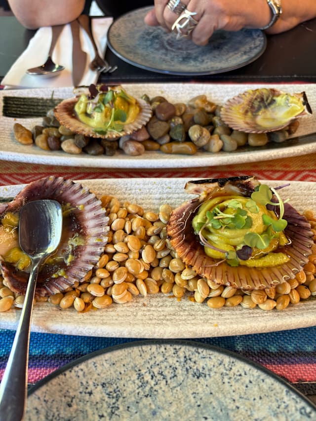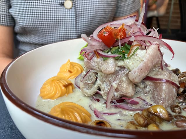 Dados de corvina en una leche de tigre picantita, acompañado de pulpo, zamburiña y chipirones rebozados. Elaborado con ají rocoto, jugo de limón y fondo de pescado. Una versión atrevida y vibrante del ceviche clásico