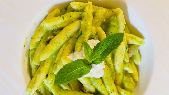 Cavatellini in crema di zucchine profumata alla menta, stracciatelle di gioia del colle e speck di suino nero lucano, salumificio don drancesco di stigliano