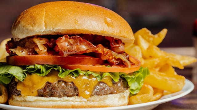 Queso cheddar americano, bacon, cebolla caramelizada, lechuga y tomate hamburguesa de 200grs de exclusivo angus irlandés
