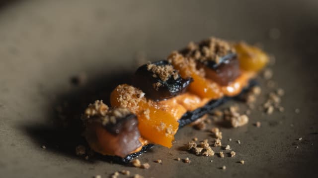 Tataki de rubia gallega madurada 45dies amb rosinyols en tempura i encenalls de foie