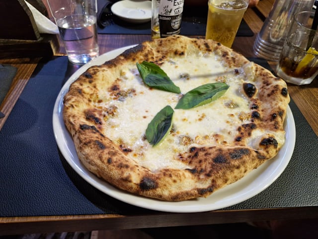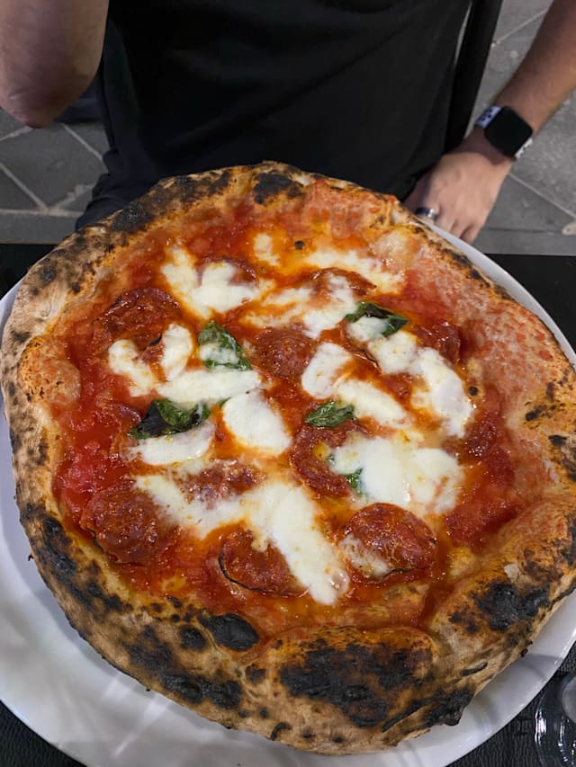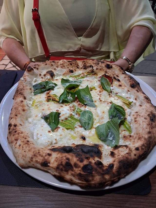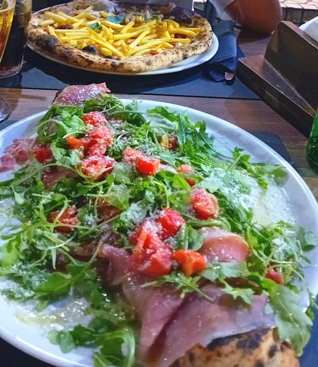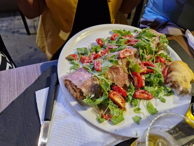 Pizza chiusa a forma di "tronchetto" ripiena di provola, ricotta di bufala casertana, gorgonzola dolce in uscita ricoperto di prosciutto crudo di parma, rucola, pomodorini, scaglie di parmigiano 32 mesi e olio evo