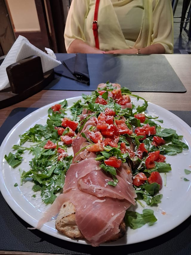 Mozzarella di bufala casertana (caseificio caputo), in uscita: prosciutto crudo di parma, rucola, pomodorini e scaglie di parmigiano 32 mesi