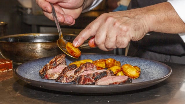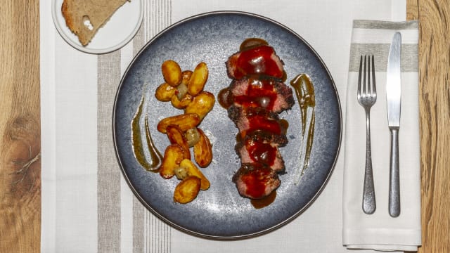 - Pan brioche artesano y mayonesa de demi-glace acompañadas de patatas fritas.
