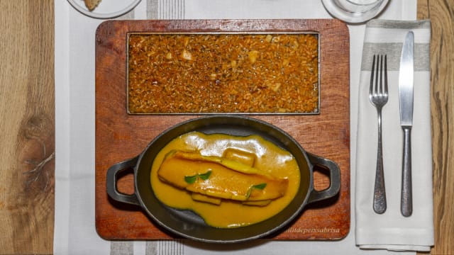 - Peix sec, tomate, patatas, pimiento rojo y verde con airbag de pan.