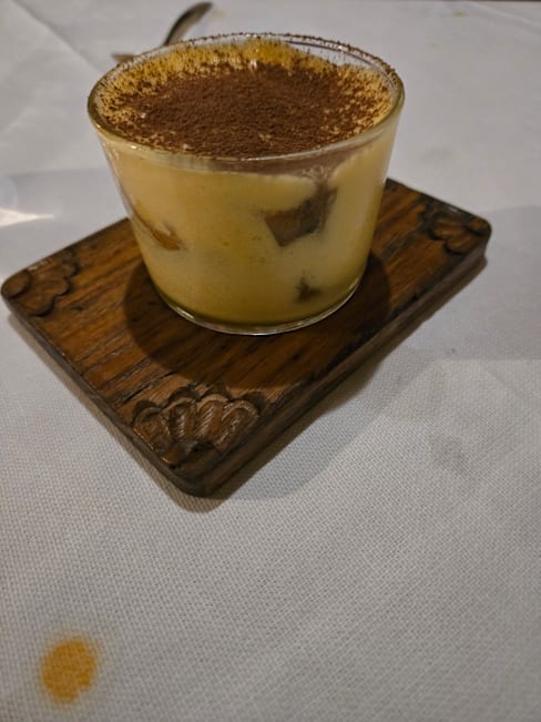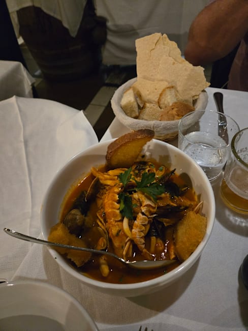 7.5/10WRONG TABLE NO DISCOUNT. Almost no right to promised discount because according to the unfriendly waitress we were not seated at her assigned 2 person table but at the table 30 cm next to it. How bizarre is that! Had the dish La cassola, a kind of fish stew consisting of 5 mussels, 3 vongoles, 2.5 crayfish, 2 baby scampi and pieces of squid soaked in tasty tomato pulp with 2 pieces of bread in it. Tasty but not really special. Dessert tiramisu had a particularly soft structure and was tasty. Coffee was made with a percolator. Other dishes that passed by for the other guests looked good. Ambiance was cozy.