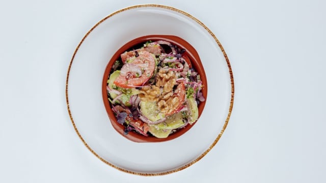 Insalata con cetrioli e pomodori, condita con cipolle fresche, noci, aceto e olio
