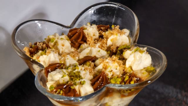 Con mantequilla de gofio, trufa, parmesano curado 36 meses, crujiente de pistachos y millo.