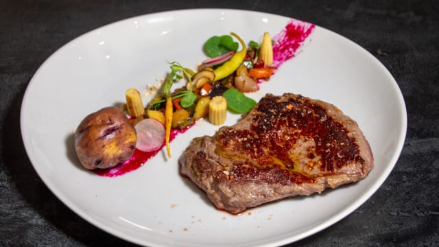 Jugoso sobrecostilla de wagyū con guacamole, espuma de papas negras, parmesano curado 36 meses y tomates cherry