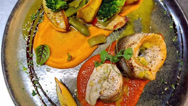 - (acompanhado de puré de cenoura e batata doce no forno e molho de pimento assado)