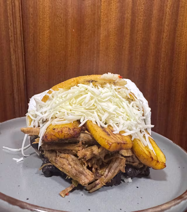 - Carne mechada, alubias negras,platano, queso blanco, arroz blanco, aguacate y arepita