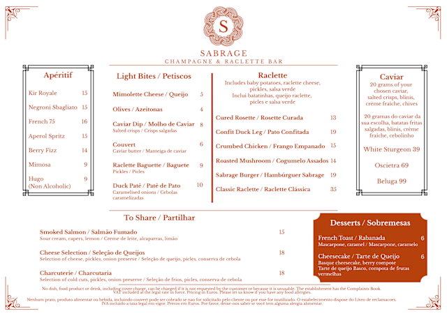 Sabrage Champagne and Raclette Bar is identified as offering european cuisine.