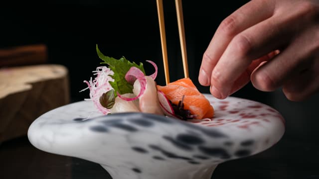Entrée - sashimi de saumon, jus de yuzu, huile de sésame