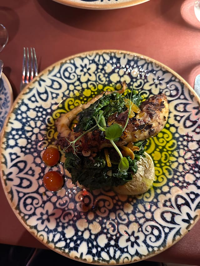 5.5/10Duck was overcooked and dry. Poor presentation. Octopus was just okay and not. as good as we have had other places in the city. The vegetables on the duck plate were chewy. Not a green thing on the duck plate. Everything was brown. Very few choices in wine by the glass. Our red wine was reserva and much too cold. There are better places to eat.
