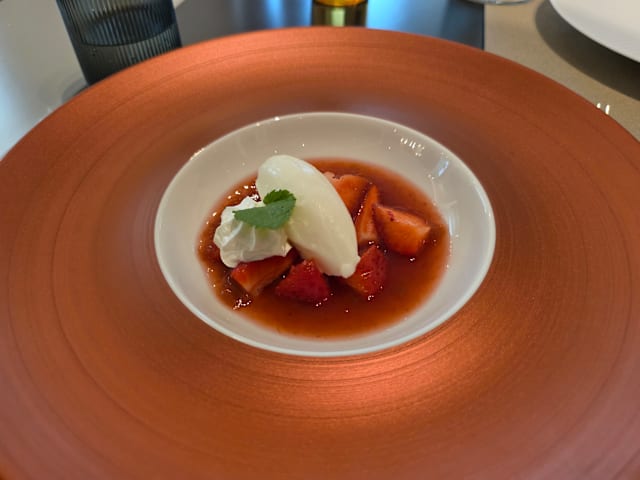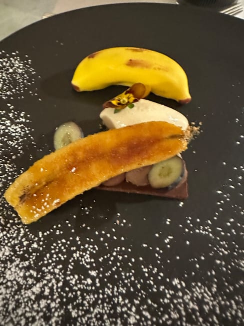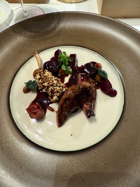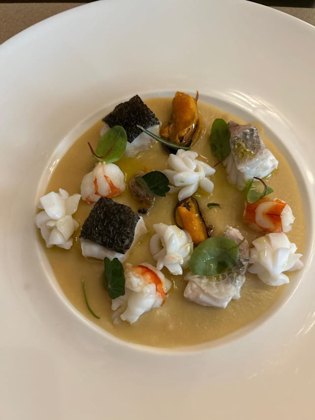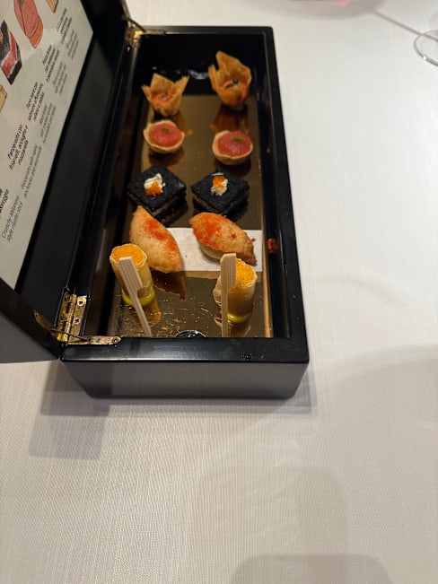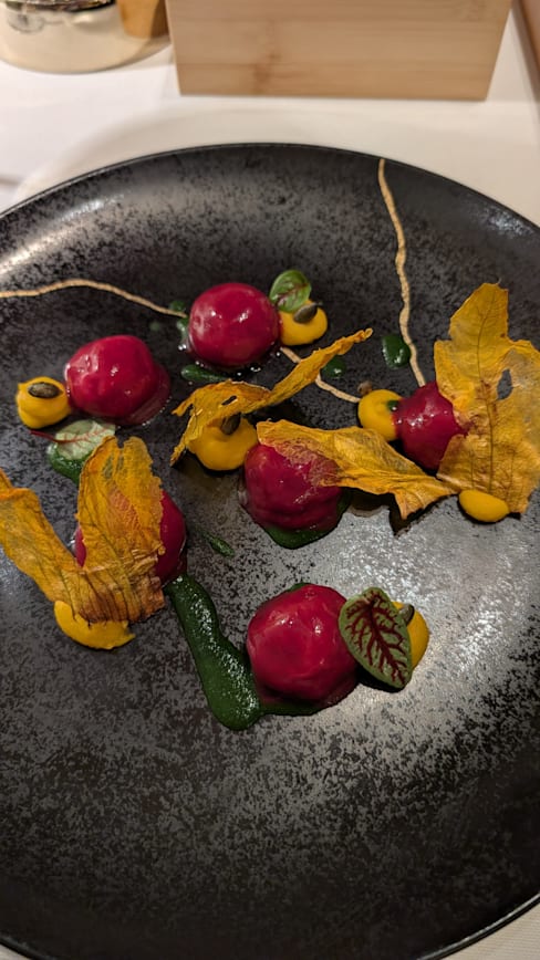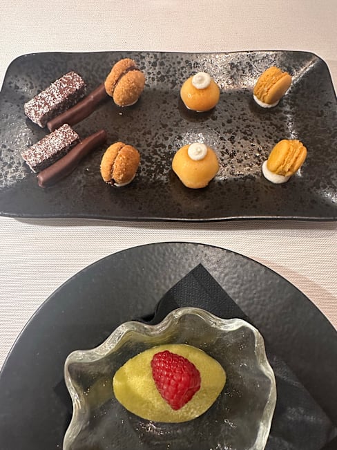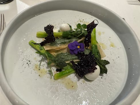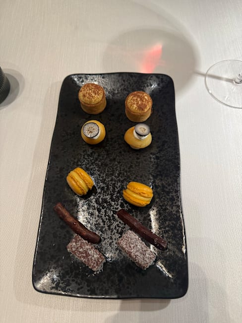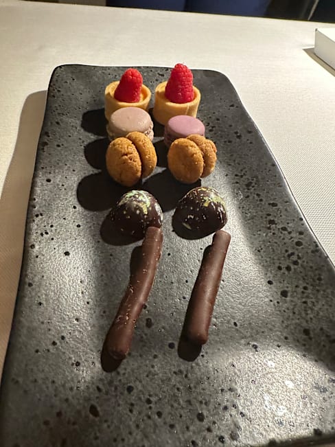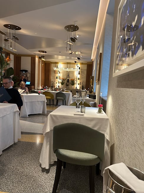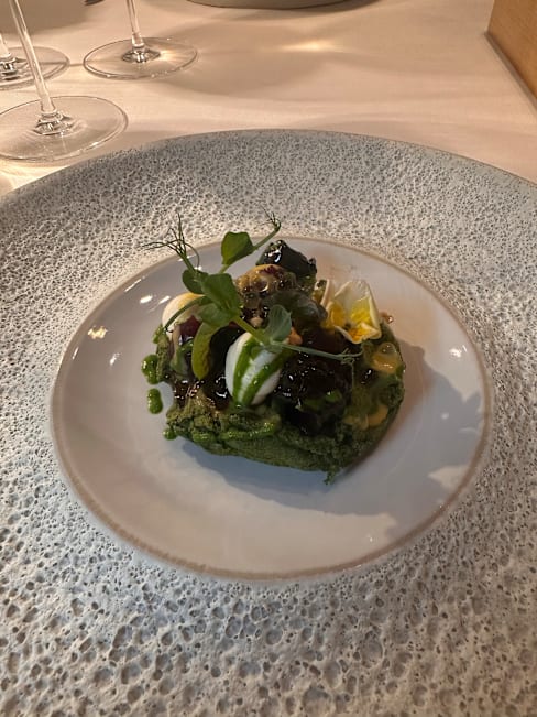 8.5/10+1The food was pretty good the starters came in a box and were very good. We also enjoyed the appetizers. The 2nd course was bland. I had gnocchi with blue cheese, the gnocchi were tasteless and the blue cheese I found bitter and strong. My wife had the risotto that was nice but a bit salty. By the time the main course came we were so full it was hard to fully enjoy. The black cod was excellent, the vegetables and all the little extras were also excellent. Same with dessert. The service was very attentive and plating was incredibly. The wines were nice. The ambience was understated and elegant. It was fun to try a Michelin starred restaurant,
