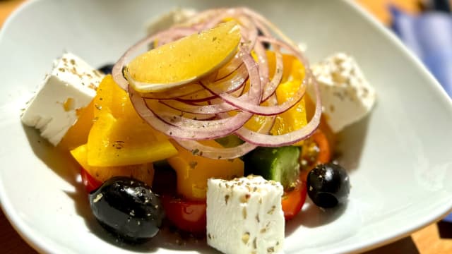 Thin slices of salted salmon served over greens, tomatoes and feta cheese with a light dressing and pine nuts