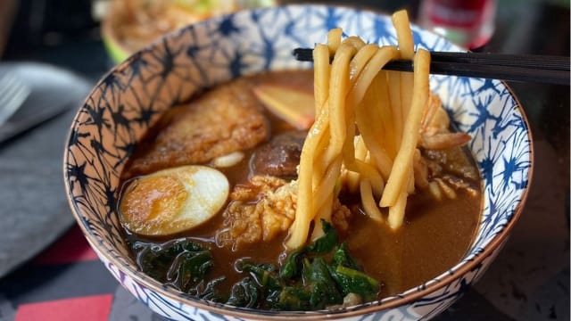Zuppa di udon al curry giapponese con ravioli di verdure fritti (3pz)