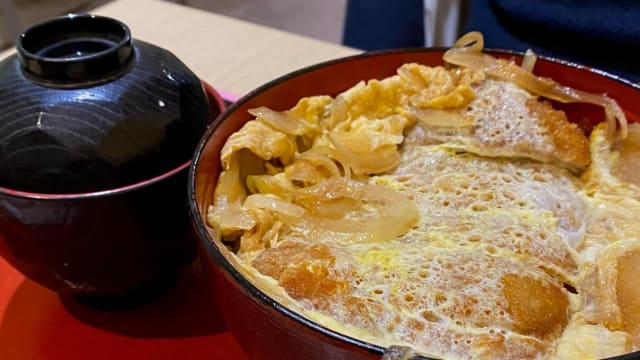 Cotoletta di maiale alla giapponese con salsa a base di soia, uova, cipolla su base di riso