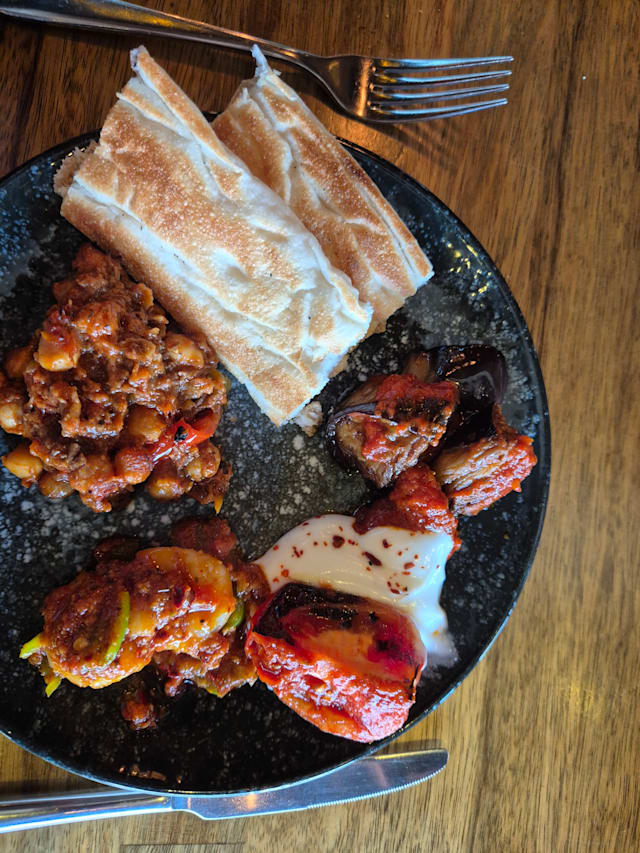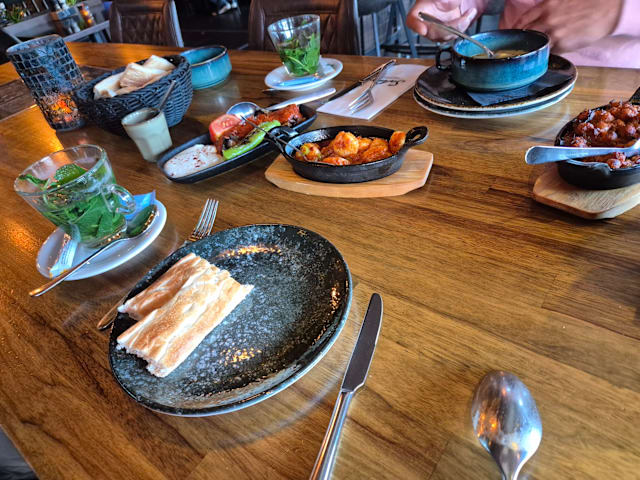 7/10Been here twice - one a takeaway and other a sit in. Review below for the sit-in dinner. The cold and warm mezes were delicious. The mains (Sahan platter, Shoarma) were middle of the road. The chicken wings were nice. Service was slow and inattentive as it started to get busy. They looked understaffed. But the staff were courteous and friendly, just a bit clueless. Ambiance was lovely. Overall - will go back. Would change 2 things though- go in slightly early before the crowd picks up. Order a larger combo of Mezes (hot and cold) and mains would pass on.