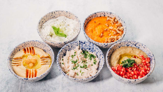 Crema de garbanzo salsa tahni, aderezada con ajo, limón y aceite de oliva