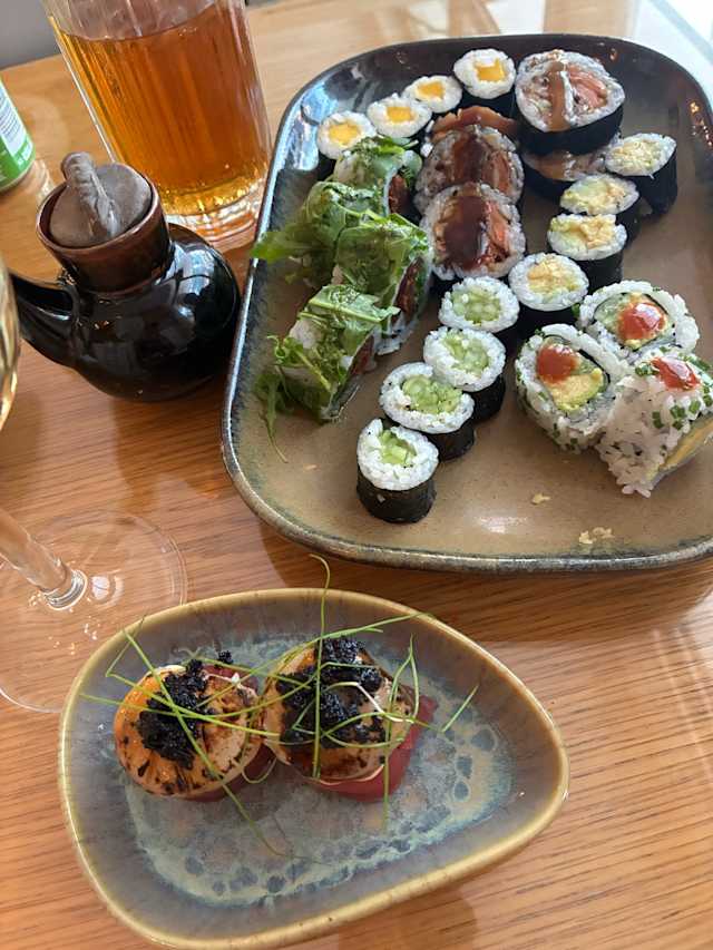 Salmon, shrimp and avocado california maki, finished with chives and sesame seeds.