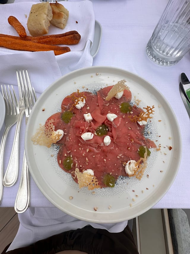 Risotto con carpaccio di gamberi di santa margherita, polvere di erbe e prescinsêua