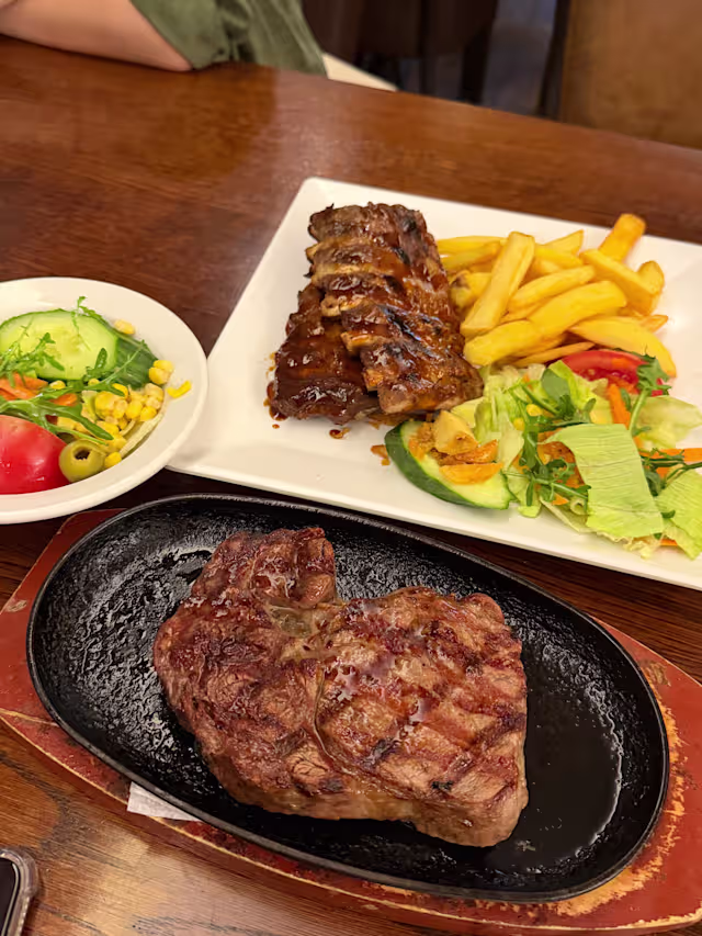 - 100 gram rump steak, 100 gram sirloin steak, and spareribs
