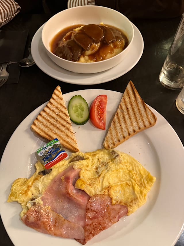8/10Food was good, we all enjoyed it. We got a French onion soup, a goulash, the veal meatball on mash and the rack of ribs. It felt like traditional pub quality food for Amsterdam. We also got the mini Dutch pancakes between 3 of us. This was a great last minute add. Our waiter, (didnt get his name unfortunately) was a legend. Super patient. Double checked the kitchen for a nut allergy. Saw him serve everyone table with so much passion and patience, we all commented on it. Especially the couple sat behind us, they were giving him a HARD time and being objectively very difficult (should have gone to a 6 star fine dining restaurant with the requests they were making) and he was patient and just kept smiling and constantly went out of his way. He deserves more than whatever he’s getting paid.