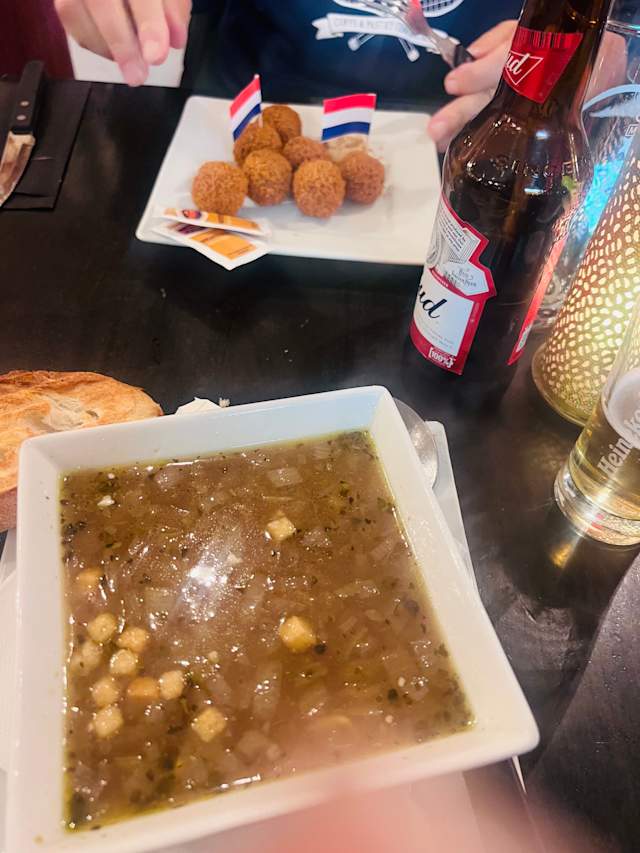 8/10Food was good, we all enjoyed it. We got a French onion soup, a goulash, the veal meatball on mash and the rack of ribs. It felt like traditional pub quality food for Amsterdam. We also got the mini Dutch pancakes between 3 of us. This was a great last minute add. Our waiter, (didnt get his name unfortunately) was a legend. Super patient. Double checked the kitchen for a nut allergy. Saw him serve everyone table with so much passion and patience, we all commented on it. Especially the couple sat behind us, they were giving him a HARD time and being objectively very difficult (should have gone to a 6 star fine dining restaurant with the requests they were making) and he was patient and just kept smiling and constantly went out of his way. He deserves more than whatever he’s getting paid.