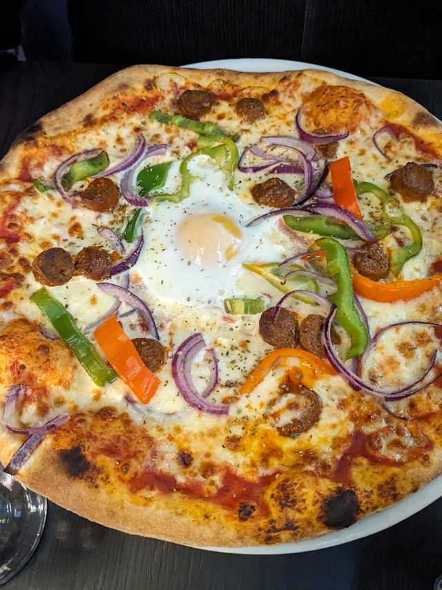 - Tomate, mozzarella, merguez, poivrons, Oignons rouges, œuf