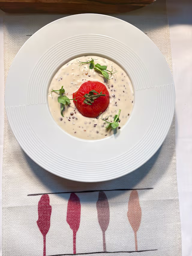 - Jarret de veau mijote dans du vin rouge, servi avec un accompagnement de haricots rouges, sauce tomate maison, copeaux de parmesan, persil frais et micro-pousses pour une finition raffinée.