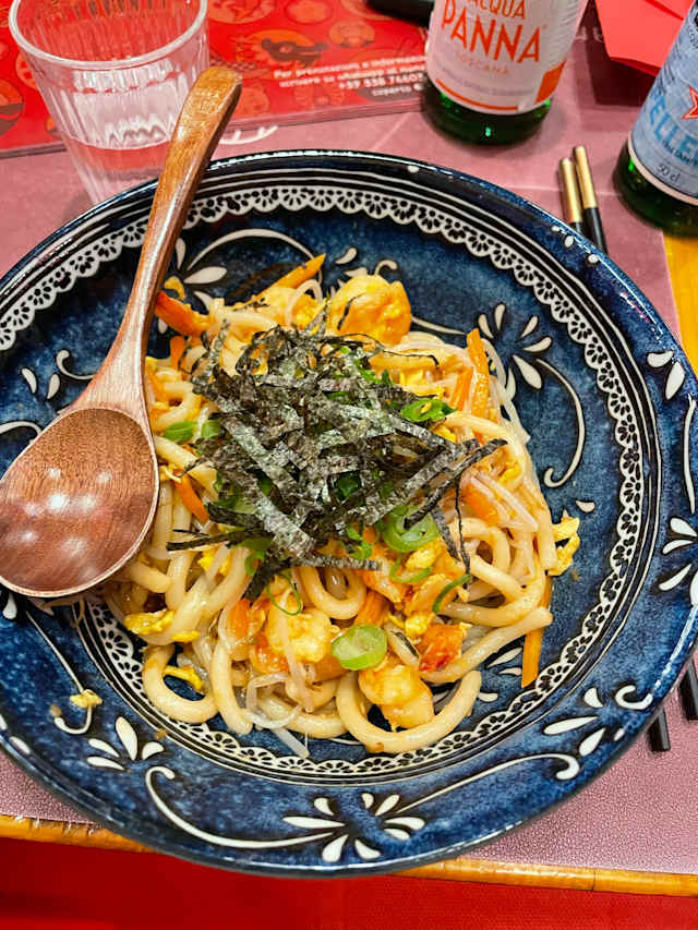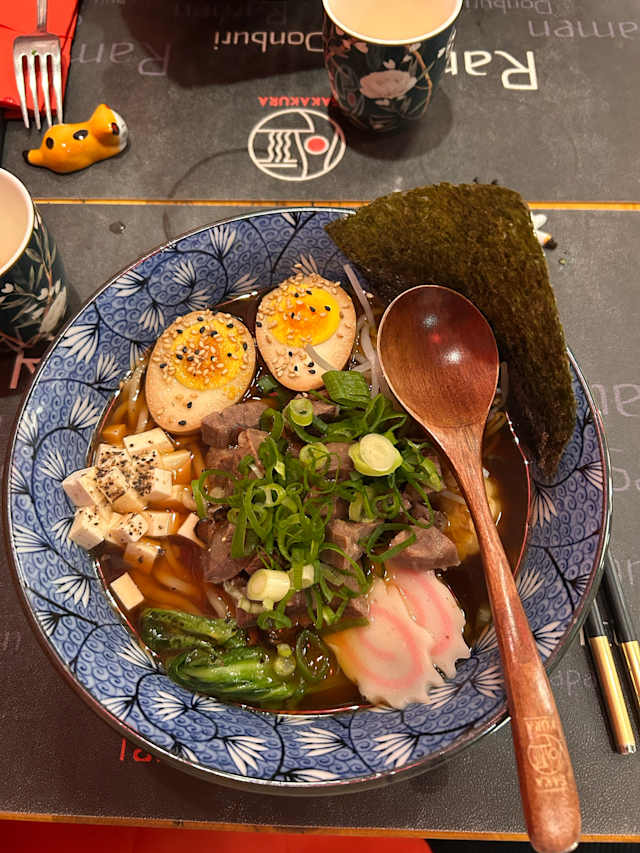 - Brodo di manzo con stufato di manzo, tofu, pak-choi, uova marinata, alghe nori, naruto, funghi shitake, germogli di soia, mais