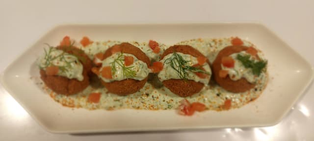 Riso avvolto in alga nera, fritto in tempura con al interno philadelphia, pulled chicken, guacamole, salsa dello chef leggermente piccante, teriyaki, pomodoro confit per guarnire