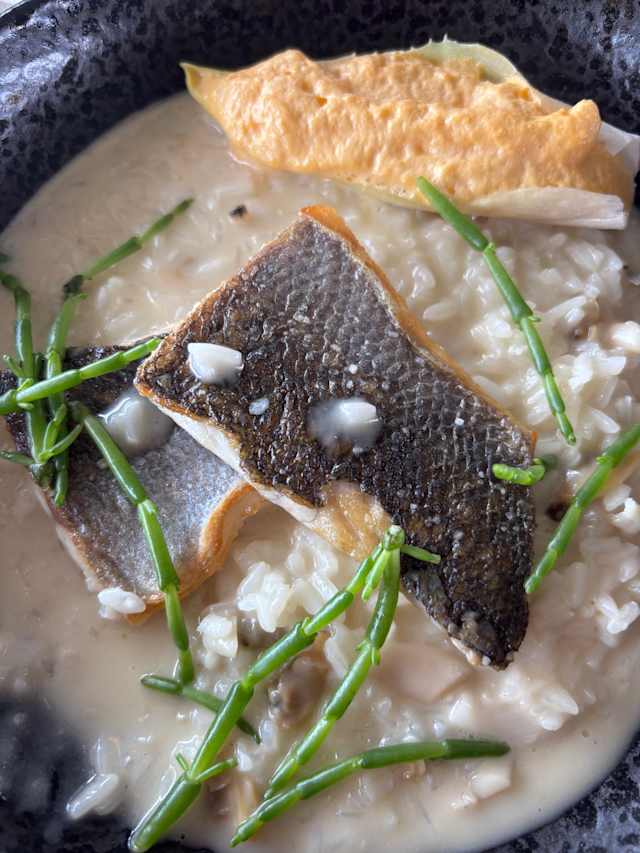 - Arroz cremoso de coentros com cachaço de bacalhau confitado