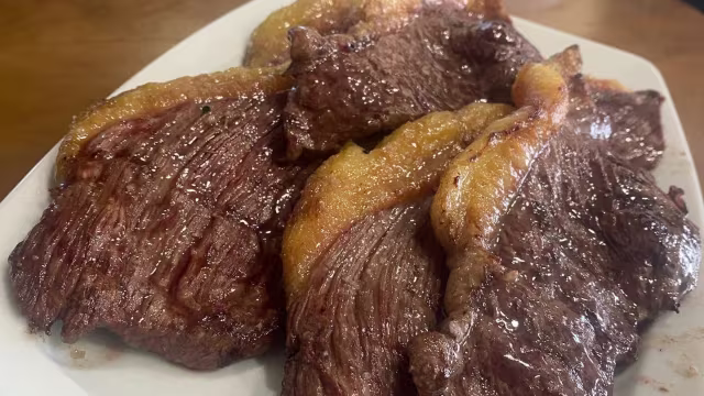 - Lombo de boi , com batata frita/arroz e ovo estrelado