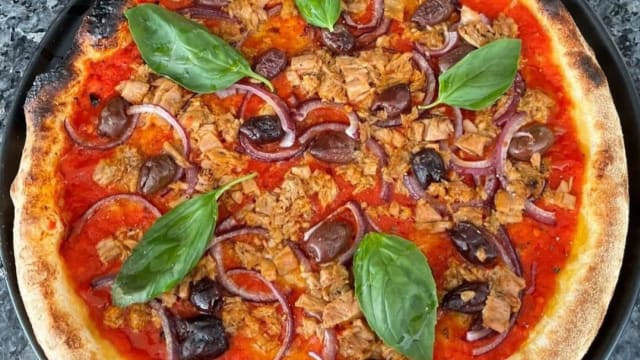 Tomate, cebola roxa, azeitonas, atum e orégaos