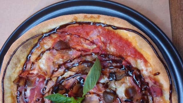 Tomate, mozzarella fior di latte, pancetta, cebolinha agridoce, creme balsamico e manjericao