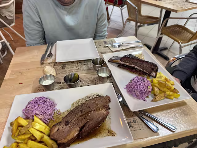 - Costillas de raza irlandesa, ahumadas durante 8 horas con madera de roble francés. Guarnición: ensalada de col y patatas fritas