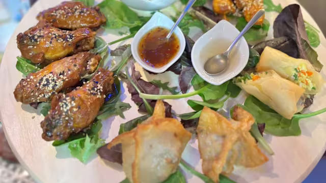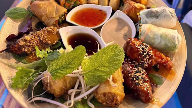 - Combinaciones de aperitivos con 2 alitas de bufalo, 4 rollitos de cerdo, 1 rollo primavera, 2 brochetas de pollo satay, 1 rollo vietnamita y 2 wontones.