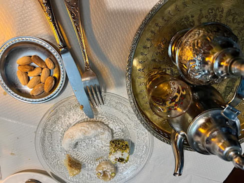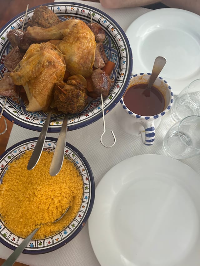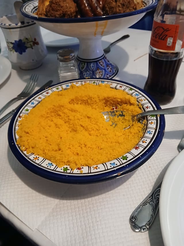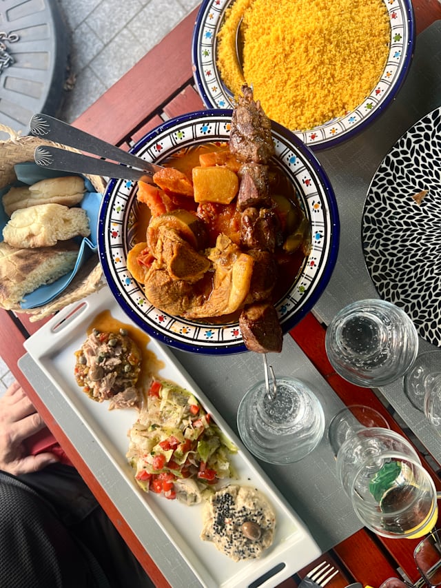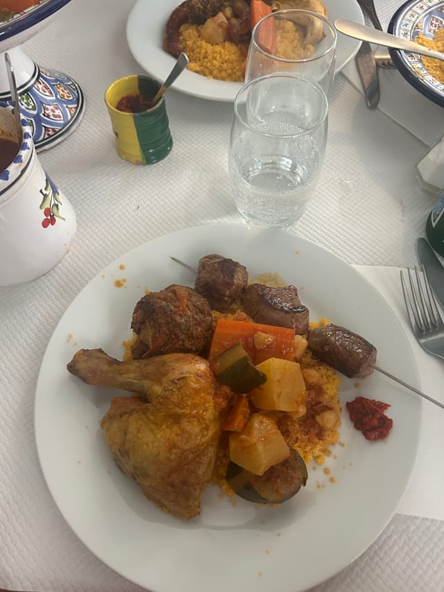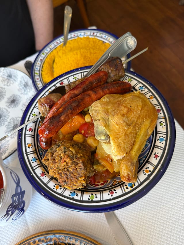 10/10Enjoyed dinner here. It's a Tunisian couscous, not Moroccan. Thicker sauce with tomato concentrate, no raisins, couscous itself has tomato and spices. Service good. Ambiance too. Mint tea afterwards has orange flower water. Recommended.