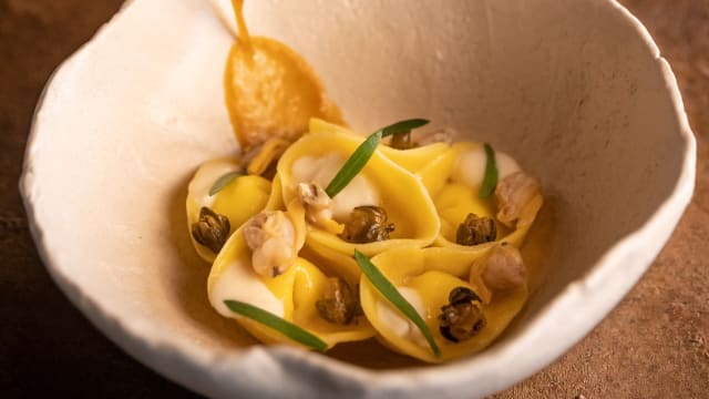 - Bottoni ripieni di ricciola, salicornia e limone salato