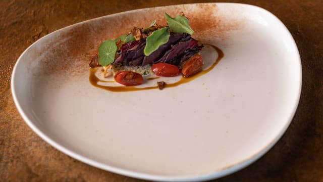 - Melanzana in doppia cottura, salsa romesco, caprino e basilico