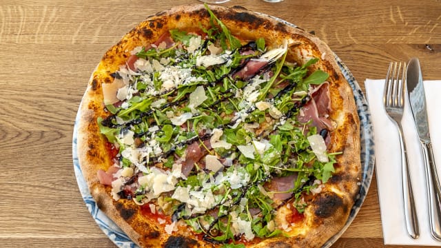 Mozzarella, lufttorkad skinka, buffelmozzarella, körsbärstomater, ruccola & grana padano