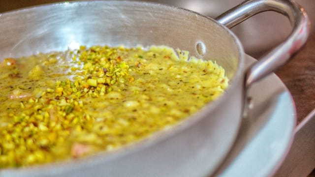 - Arancine di riso, con bacon di maialino nero, vastedda del belice e pistacchio. (cipolla soffritta, vino, sale, pepe, olio evo, grana padano, burro)