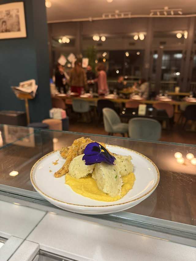 - Baccalà mantecato su crema di sedano rapa, con ciuffo di carciofi in tempura