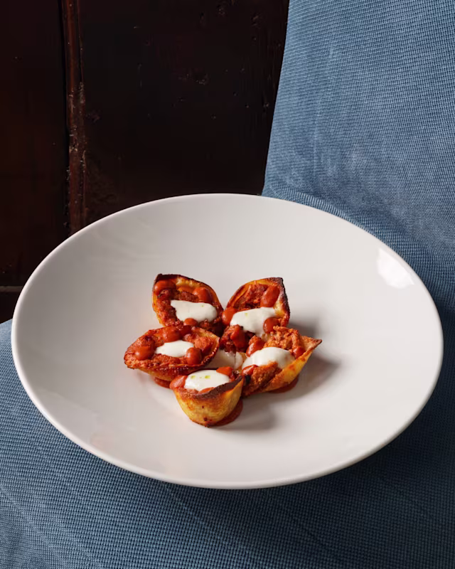 - Tortello alla genovese con chutney di mela annurca e spuma di pecorino