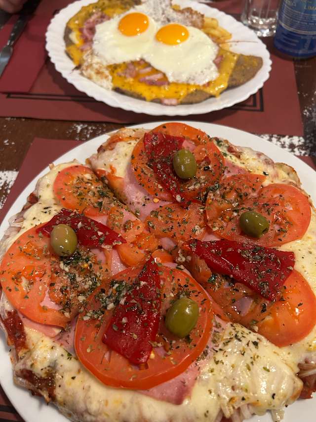 - Carne de ternera tiernizada, con salsa de tomate, jamon cocido, mozzarella, tomate en rodajas y orégano.