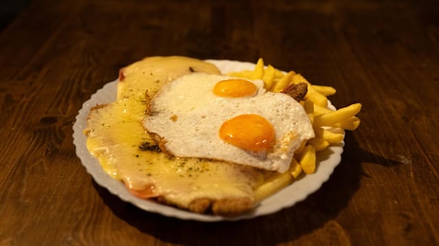 Milanesa, salsa de tomate, mozzarella y jamón dulce.