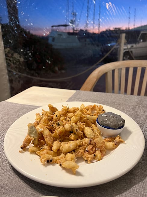 8.5/10It’s the second time we are here and we love the fresh fish fished the same day, it is perfectly cooked or grilled and taste like heaven. If you love fish and want it to taste at the most go here! The staff is stressed and they forget things all the time but they are nice and are doing there best. The surroundings outside is nice but you have to be four or more to have the table’s by the harbour so we felt that we sat half the way indoors both times and it was very hot, but to be fair it was some of the hottest day’s i the middle of the summer.