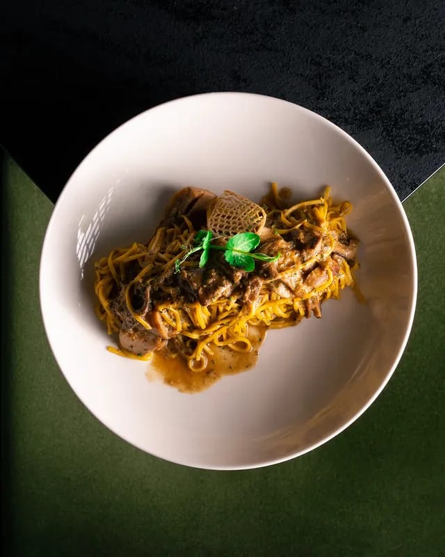 - Tagliatelle di calamari, crema di piselli, pepe rosa e olio all’arancia